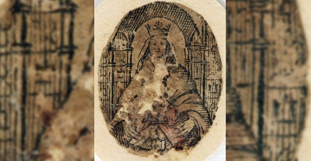 Mas o chefe, lamentando a solidão das florestas, recusa o batismo. A Virgem Maria então aparece para ele uma segunda vez. Furioso, ele quer matá-la com seu arco. Mas a aparição desaparece, deixando-lhe um pequeno pergaminho na mão: sua imagem. Ela é representada sentada, carregando o Menino Jesus no colo. Jesus segura o globo terrestre com a mão esquerda e abençoa com a mão direita.